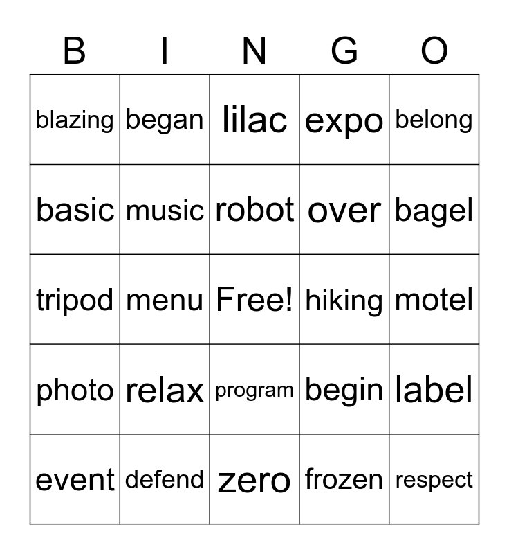 This bingo card has a free space and 24 words: relax, defend, robot, event, belong, blazing, basic, began, hiking, program, over, tripod, begin, label, music, frozen, motel, lilac, bagel, menu, respect, photo, expo and zero.