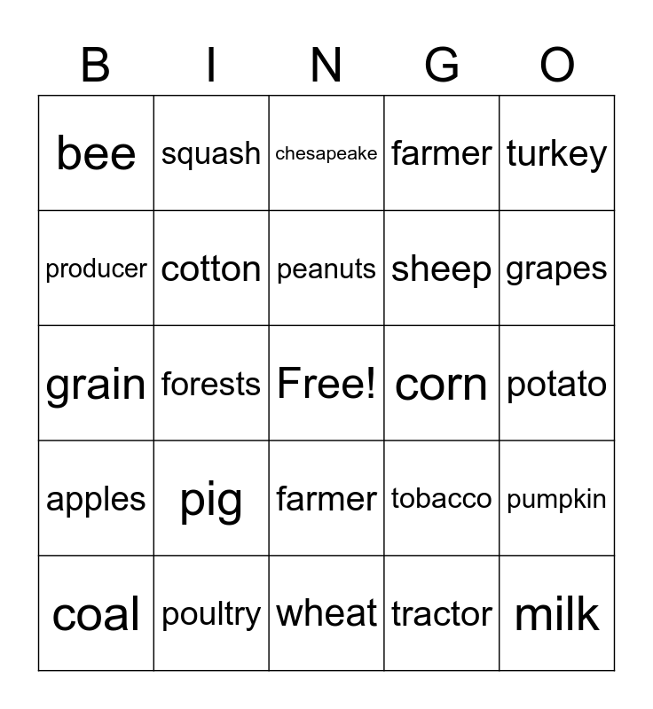 This bingo card has a free space and 24 words: pig, poultry, peanuts, coal, turkey, bee, producer, squash, corn, farmer, sheep, grain, tobacco, pumpkin, cotton, tractor, potato, chesapeake, grapes, forests, milk, apples, farmer and wheat.