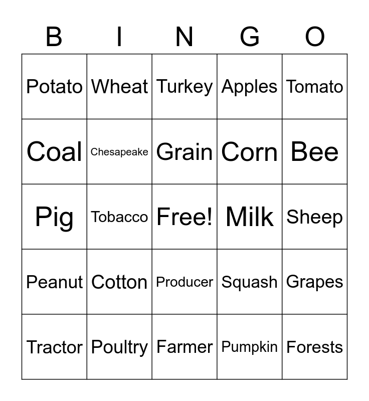 This bingo card has a free space and 24 words: Cotton, Poultry, Grain, Tractor, Tomato, Potato, Coal, Wheat, Milk, Producer, Corn, Pig, Squash, Grapes, Chesapeake, Pumpkin, Sheep, Turkey, Bee, Tobacco, Forests, Peanut, Apples and Farmer.
