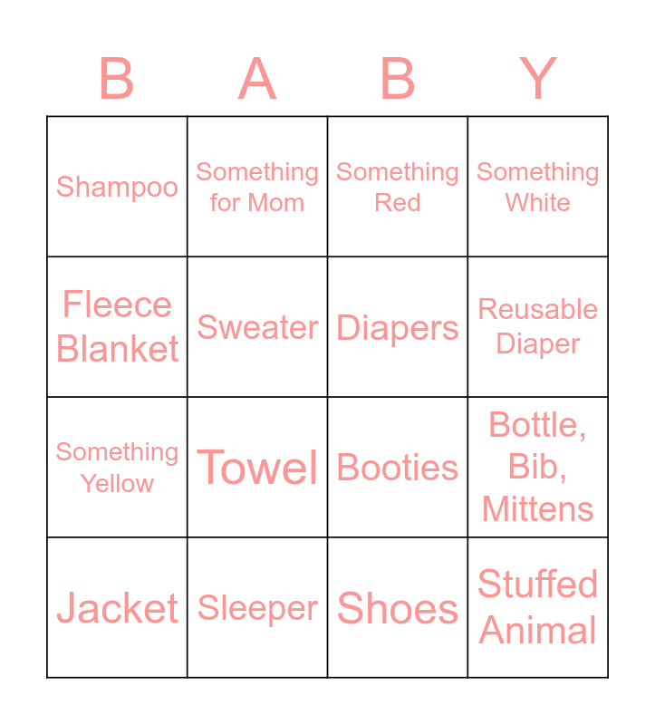 This bingo card has 29 words: Pacifier, Swaddle Blanket, Bottle, Bib, Mittens, Socks, Shampoo, Something Red, Diapers, Onsie, Sleeper, Book, Shoes, Jacket, Something Blue, Hat, Towel, Teether, Bib, Stuffed Animal, Fleece Blanket, Booties, Something Handmade, Burp Cloths, Something Yellow, Sweater, Something White, Something for Mom, Toys, Reusable Diaper and Something Personalized.