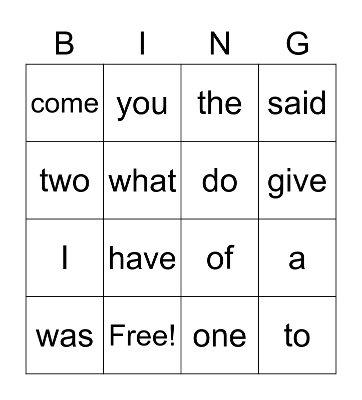 This bingo card has 16 words: Free!, a, the, come, I, you, of, one, two, what, was, said, have, give, do and to.