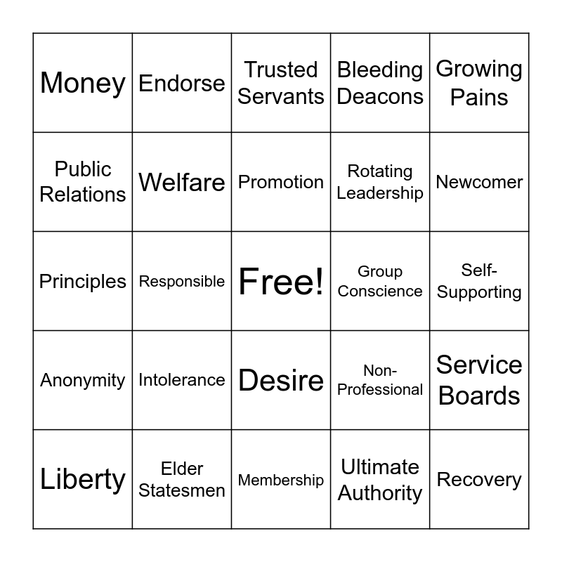 This bingo card has a free space and 43 words: Common Welfare, Recovery, Unity, Liberty, Group, Ultimate Authority, Trusted Servants, Loving God, Growing Pains, Elder Statesmen, Bleeding Deacons, Group Conscience, Desire, Intolerance, Fear, Membership, Autonomous, Principles, Primary Purpose, Newcomer, Endorse, Finance, Prestige, Money, Property, Self-Supporting, Contributions, Prudent Reserve, Non-Professional, Anonymity, Humility, Service Boards, Committees, Responsible, Spirit of Service, Public Controversy, Attraction, Promotion, Public Relations, Rotating Leadership, Obligation, Welfare and Affiliation.