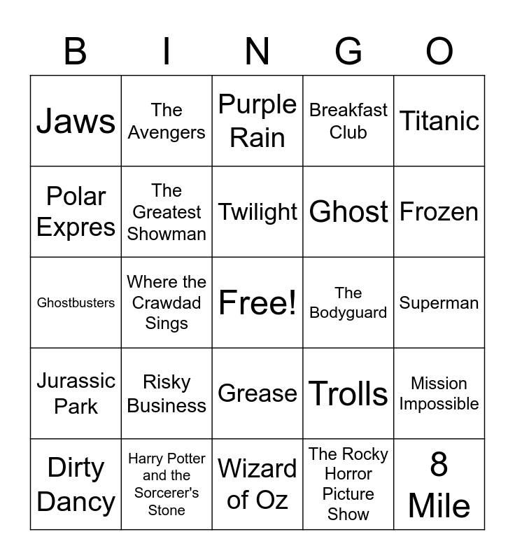 This bingo card has a free space and 50 words: Schindler's List, 8 Mile, National Lampoon's Vacation, Wizard of Oz, Risky Business, Pirates of the Caribbean, The Avengers, Raiders of the Lost Ark, Polar Expres, O Brother Where Art Thou, The Greatest Showman, Breakfast Club, Mission Impossible, Trolls, Flashdance, Footloose, Twilight, The Bodyguard, Coyote Ugly, Titanic, Where the Crawdad Sings, The Rocky Horror Picture Show, Jaws, Ghost, That Thing You Do, Star Wars, Frozen, Rocky IV, Purple Rain, Grease, The Pink Panther, Robin Hood, Soul, Encanto, Harry Potter and the Sorcerer's Stone, Men In Black, Toy Story, 9 to 5, A Star Is Born, Superman, Psycho, Top Gun, Pitch Perfect, Austin Powers, Dirty Dancy, Ghostbusters, Armageddon, Shrek, Jurassic Park and Moulin Rouge.