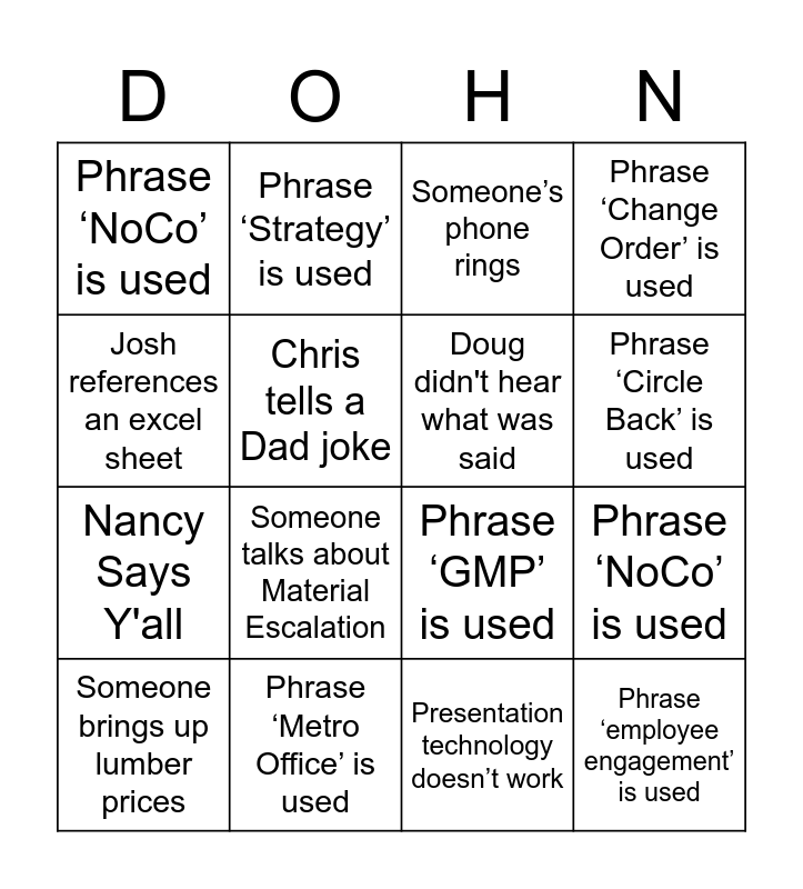 This bingo card has 29 words: Free!, Phrase ‘Constructability' is used, Phrase ‘NoCo’ is used, Someone’s phone rings, Phrase ‘NoCo’ is used, Someone’s phone rings, Doug didn't hear what was said, Neal tells a story about his kids, Phrase ‘Metro Office’ is used, Presenter says ‘umm’, Presentation technology doesn’t work, Someone brings up lumber prices, Reed makes a joke, 30th Anniversary is mentioned, Someone talks about Material Escalation, An acronym is used, Someone says ‘DCI’, Phrase ‘employee engagement’ is used, Josh references an excel sheet, Phrase ‘GMP’ is used, Phrase ‘anticipated’ completion’ is used, Icebreaker game is played, Nancy Says Y'all, Chris tells a Dad joke, Phrase ‘Change Order’ is used, Phrase ‘Strategy’ is used, Phrase ‘Critical Path’ is used, Phrase ‘Circle Back’ is used and Phrase 'Lead Time' is used.