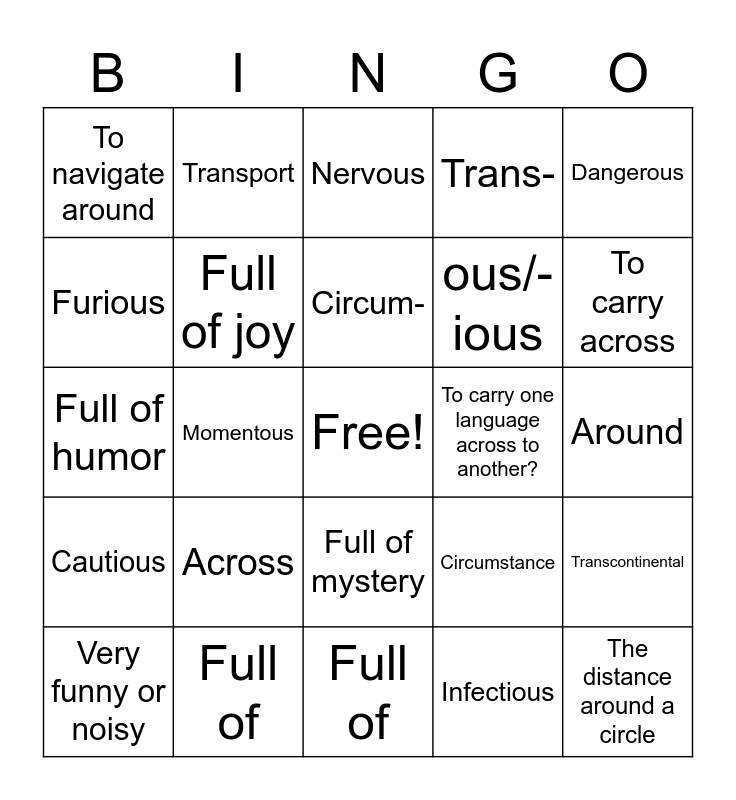 This bingo card has a free space and 24 words: Across, Full of, Circum-, Very funny or noisy, Dangerous, To navigate around, Furious, Transport, To carry one language across to another?, Full of mystery, ous/-ious, Full of humor, Circumstance, Transcontinental, Full of joy, Infectious, Around, Nervous, To carry across, Momentous, The distance around a circle, Cautious, Trans- and Full of.