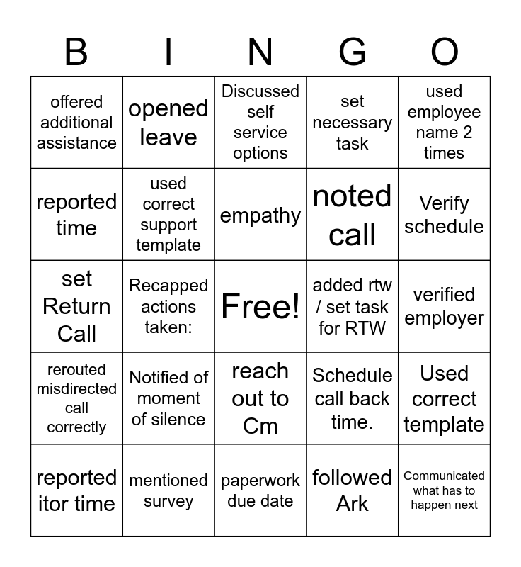 This bingo card has a free space and 25 words: Notified of moment of silence, paperwork due date, empathy, reported itor time, used employee name 2 times, offered additional assistance, reported time, opened leave, added rtw / set task for RTW, reach out to Cm, noted call, set Return Call, Schedule call back time., Used correct template, used correct support template, used Cm template to reach out, verified employer, Discussed self service options, Verify schedule, Recapped actions taken:, Communicated what has to happen next, mentioned survey, rerouted misdirected call correctly, set necessary task and followed Ark.