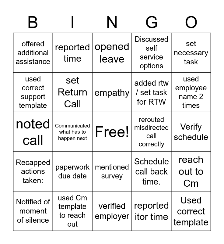 This bingo card has a free space and 25 words: Notified of moment of silence, paperwork due date, empathy, reported itor time, used employee name 2 times, offered additional assistance, reported time, opened leave, added rtw / set task for RTW, reach out to Cm, noted call, set Return Call, Schedule call back time., Used correct template, used correct support template, used Cm template to reach out, verified employer, Discussed self service options, Verify schedule, Recapped actions taken:, Communicated what has to happen next, mentioned survey, rerouted misdirected call correctly, set necessary task and followed Ark.