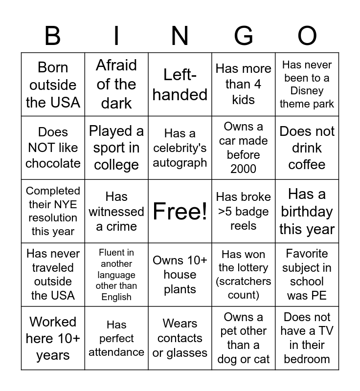 This bingo card has a free space and 24 words: Fluent in another language other than English, Has perfect attendance, Has a celebrity's autograph, Worked here 10+ years, Has never been to a Disney theme park, Born outside the USA, Does NOT like chocolate, Afraid of the dark, Has broke >5 badge reels, Owns 10+ house plants, Owns a car made before 2000, Completed their NYE resolution this year, Has won the lottery (scratchers count), Favorite subject in school was PE, Played a sport in college, Owns a pet other than a dog or cat, Has a birthday this year, Left-handed, Does not drink coffee, Has witnessed a crime, Does not have a TV in their bedroom, Has never traveled outside the USA, Has more than 4 kids and Wears contacts or glasses.