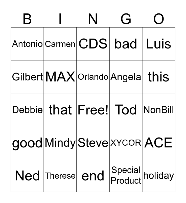 This bingo card has a free space and 24 words: Mindy, Therese, Orlando, Ned, Luis, Antonio, Gilbert, Carmen, Tod, Steve, Angela, Debbie, XYCOR, ACE, MAX, Special Product, NonBill, CDS, this, that, holiday, good, bad and end.