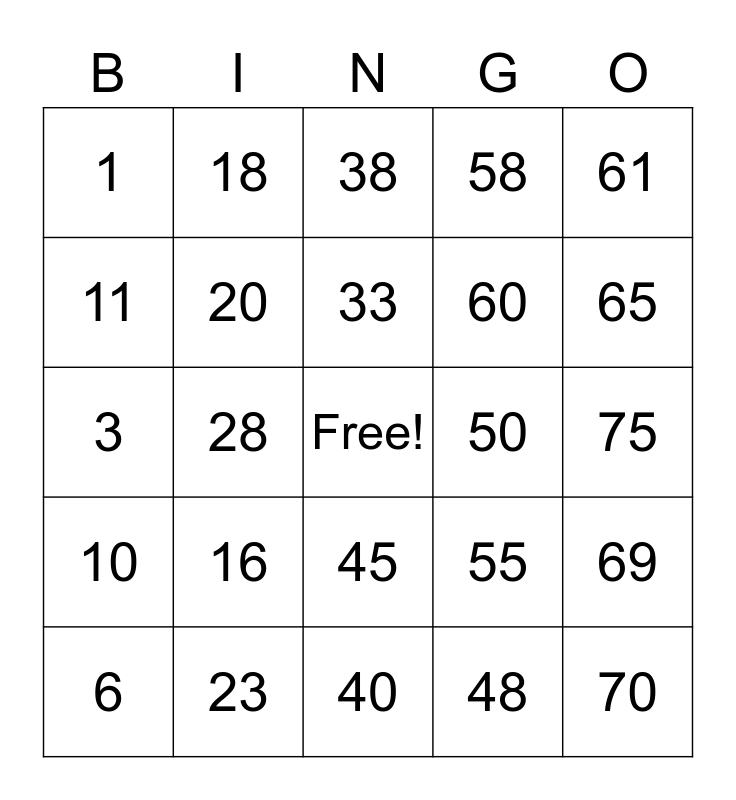 This bingo card has a free space and 24 words: 6, 16, 33, 48, 61, 1, 18, 38, 50, 75, 3, 20, 55, 69, 11, 23, 40, 58, 65, 10, 28, 45, 60 and 70.
