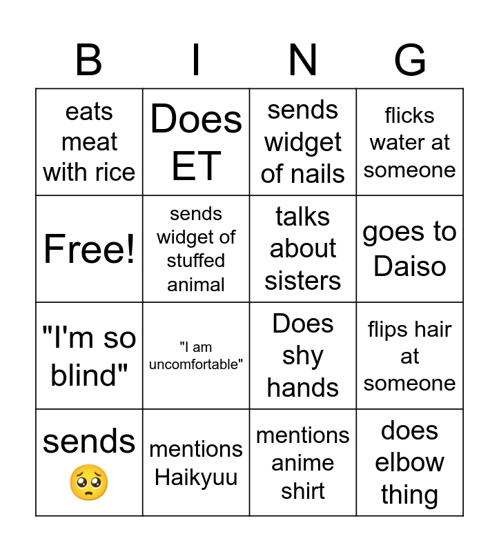 This bingo card has 16 words: mentions Haikyuu, flips hair at someone, sends widget of nails, eats meat with rice, "I'm so blind", Does ET, Does shy hands, mentions anime shirt, Free!, sends widget of stuffed animal, sends 🥺, flicks water at someone, "I am uncomfortable", goes to Daiso, talks about sisters and does elbow thing.