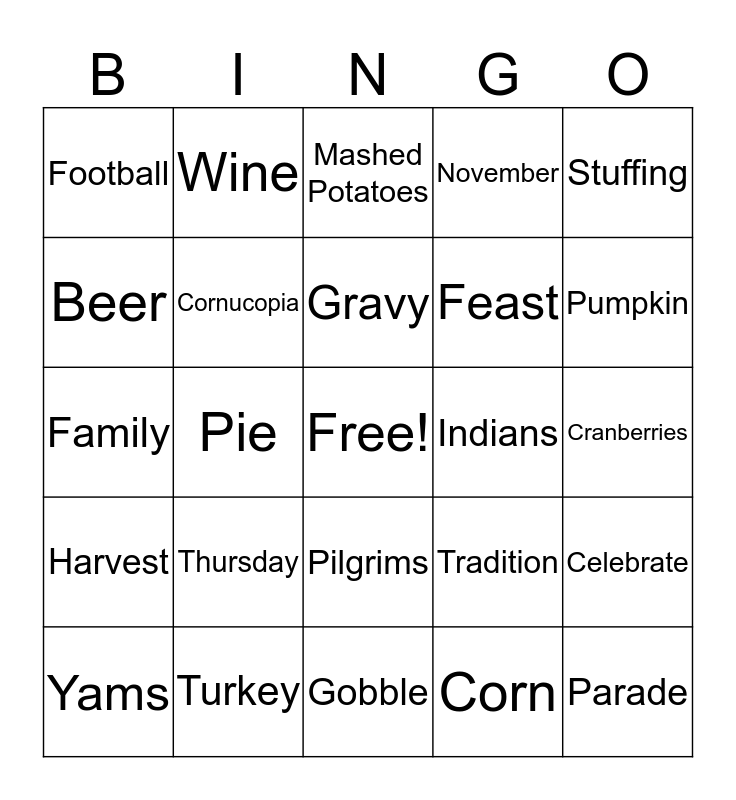 This bingo card has a free space and 24 words: Thursday, Turkey, Gravy, Yams, Stuffing, Football, Beer, Wine, Indians, Pilgrims, Feast, Family, Tradition, Celebrate, Cornucopia, Corn, Cranberries, Mashed Potatoes, Pumpkin, Pie, Parade, Harvest, November and Gobble.