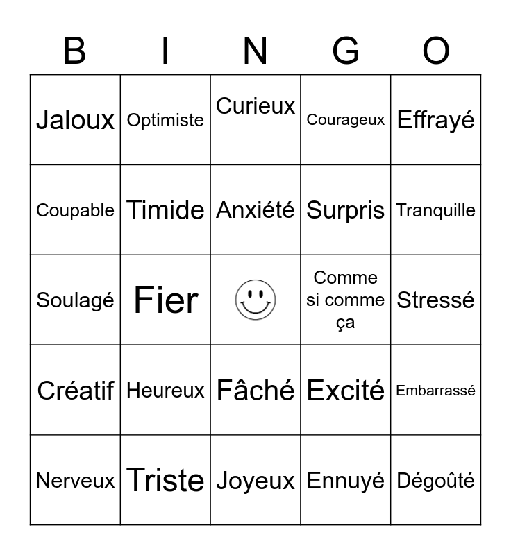 This bingo card has a free space and 24 words: Heureux, Triste, Anxiété, Nerveux, Effrayé, Jaloux, Coupable, Optimiste, Comme si comme ça, Fâché, Surpris, Soulagé, Excité, Embarrassé, Timide, Ennuyé, Stressé, Curieux, Tranquille, Fier, Dégoûté, Créatif, Courageux and Joyeux.