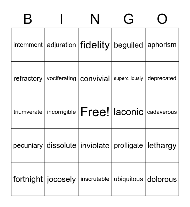 This bingo card has a free space and 29 words: fortnight, sacristan, incorrigible, emissary, internment, fidelity, vociferating, dissolute, laconic, jocosely, cadaverous, dolorous, inscrutable, ubiquitous, deprecated, expeditiously, inviolate, pecuniary, aphorism, triumverate, profligate, imperil, superciliously, refractory, beguiled, adjuration, lethargy, convivial and implacable.