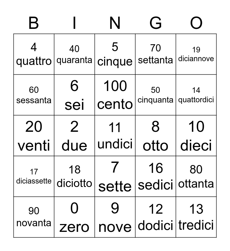 This bingo card has 30 words: 0 zero, 1 uno, 2 due, 3 tre, 4 quattro, 5 cinque, 6 sei, 7 sette, 8 otto, 9 nove, 10 dieci, 11 undici, 12 dodici, 13 tredici, 14 quattordici, 15 quindici, 16 sedici, 17 diciassette, 18 diciotto, 19 diciannove, 20 venti, 30 trenta, 40 quaranta, 50 cinquanta, 60 sessanta, 70 settanta, 80 ottanta, 90 novanta, 100 cento and 1000 mille.