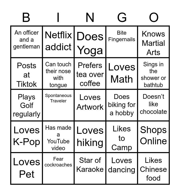 This bingo card has 25 words: Loves K-Pop, Fear cockroaches, Loves Artwork, Loves dancing, Knows Martial Arts, An officer and a gentleman, Netflix addict, Does Yoga, Does biking for a hobby, Shops Online, Posts at Tiktok, Can touch their nose with tongue, Star of Karaoke, Likes to Camp, Sings in the shower or bathtub, Loves Pet, Spontaneous Traveler, Prefers tea over coffee, Loves Math, Doesn’t like chocolate, Plays Golf regularly, Has made a YouTube video, Loves hiking, Bite Fingernails and Likes Chinese food.