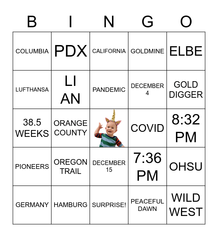 This bingo card has a free space and 24 words: OREGON TRAIL, HAMBURG, PANDEMIC, GERMANY, ELBE, COLUMBIA, LUFTHANSA, PDX, COVID, DECEMBER 15, DECEMBER 4, 38.5 WEEKS, 7:36 PM, OHSU, LI AN, PEACEFUL DAWN, 8:32 PM, CALIFORNIA, GOLD DIGGER, ORANGE COUNTY, WILD WEST, PIONEERS, GOLDMINE and SURPRISE!.