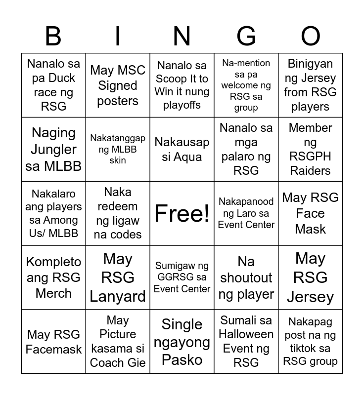 This bingo card has a free space and 24 words: May RSG Lanyard, May Picture kasama si Coach Gie, Nakausap si Aqua, May RSG Facemask, Binigyan ng Jersey from RSG players, Nanalo sa pa Duck race ng RSG, Naging Jungler sa MLBB, May MSC Signed posters, Nakapanood ng Laro sa Event Center, Sumigaw ng GGRSG sa Event Center, Nanalo sa mga palaro ng RSG, Nakalaro ang players sa Among Us/ MLBB, Na shoutout ng player, May RSG Jersey, Nakatanggap ng MLBB skin, Sumali sa Halloween Event ng RSG, May RSG Face Mask, Nanalo sa Scoop It to Win it nung playoffs, Member ng RSGPH Raiders, Naka redeem ng ligaw na codes, Nakapag post na ng tiktok sa RSG group, Kompleto ang RSG Merch, Na-mention sa pa welcome ng RSG sa group and Single ngayong Pasko.
