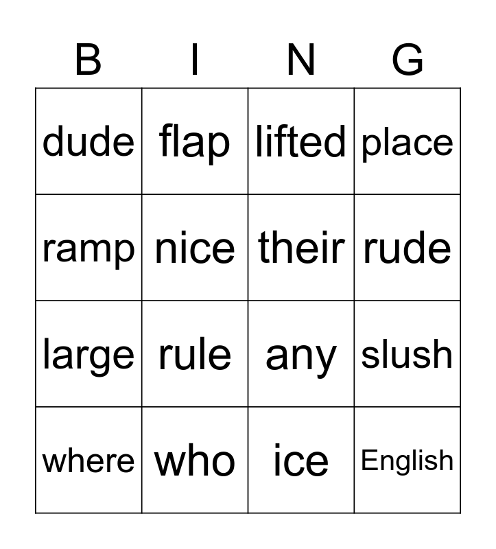 This bingo card has 32 words: click, very, slush, were, English, their, ramp, find, flap, safe, rude, lifted, these, sling, who, after, catching, any, lake, life, chase, kind, ice, water, where, place, large, nice, dude, every, glasses and rule.