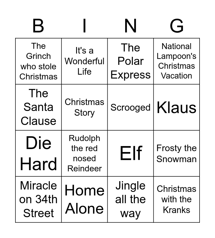 This bingo card has 16 words: Home Alone, Frosty the Snowman, The Polar Express, The Grinch who stole Christmas, Die Hard, It's a Wonderful Life, Elf, Jingle all the way, The Santa Clause, Christmas Story, Miracle on 34th Street, National Lampoon's Christmas Vacation, Rudolph the red nosed Reindeer, Klaus, Scrooged and Christmas with the Kranks.