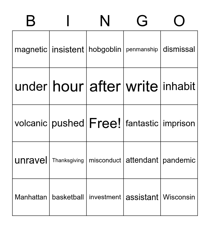 This bingo card has a free space and 45 words: athletic, Wisconsin, establish, Manhattan, Atlantic, assistant, hobgoblin, recommend, dismissal, basketball, penmanship, fantastic, misconduct, Thanksgiving, consistent, investment, discontent, volcanic, congressmen, inhabit, insistent, disinfect, inhabit, magnetic, exotic, imprison, cosmetic, transatlantic, attendant, unravel, contestant, pandemic, diminish, punishment, first, pushed, pulled, month, another, after, under, write, water, hour and people.