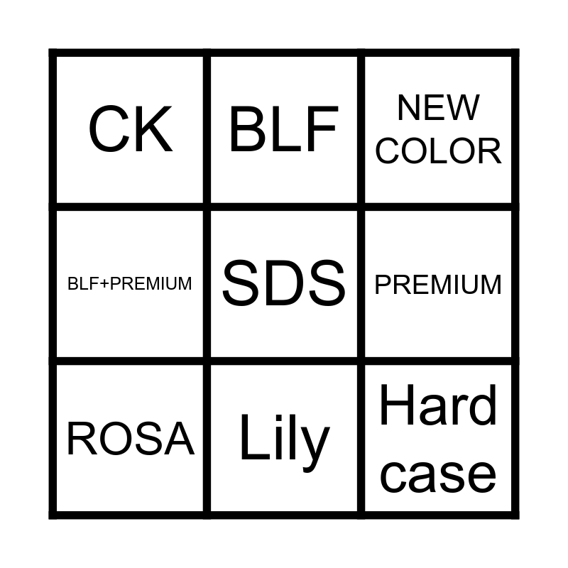 This bingo card has a free space and 18 words: NEIL, ISABELLE, NEW COLOR, CK, CK, BLF+PREMIUM, SDS, BLF, Lily, CLIP ON, ROTH, Hard case, AW22, PREMIUM, ROSA, SUNNY, SDS+BLF and Bedankt voor de goede service.