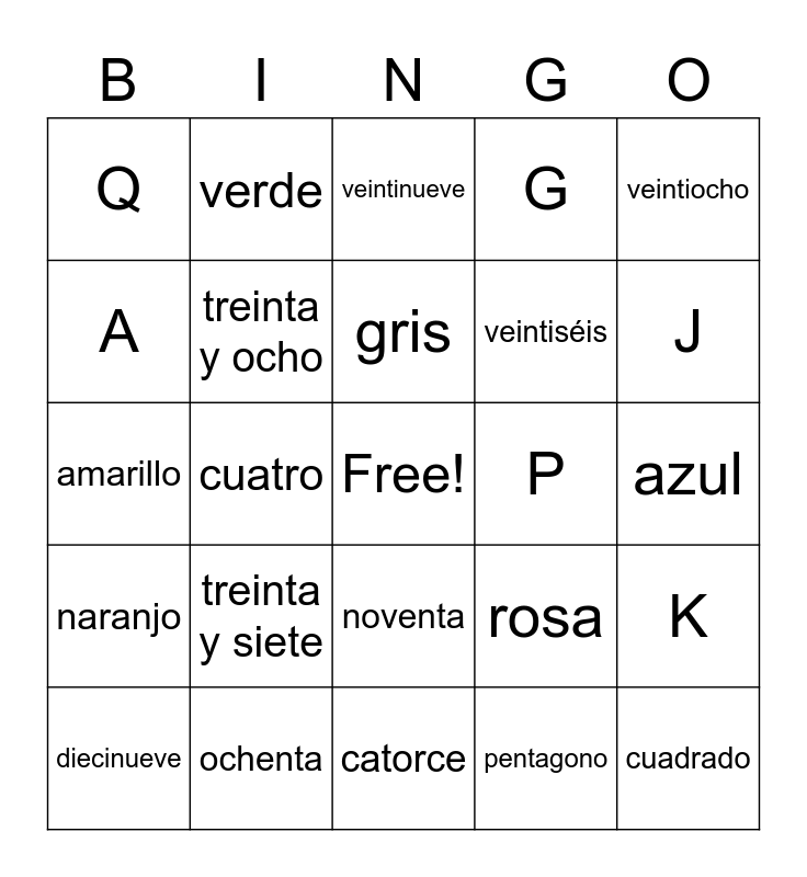 This bingo card has a free space and 94 words: doce, trece, catorce, quince, dieciséis, diecisiete, dieciocho, diecinueve, veinteuno, veintidós, veintitrés, veinticuatro, veinticinco, veintiséis, veintisiete, veintiocho, veintinueve, treinta, treinta y uno, treinta y dos, treinta y tres, treinta y cuatro, treinta y cinco, treinta y seis, treinta y siete, treinta y ocho, treinta y nueve, cuarenta, cincuenta, sesenta, ochenta, noventa, cien, rojo, verde, negro, blanco, cafe, gris, rosa, amarillo, naranjo, azul, morado, cuadrado, triangulo, circulo, rectangulo, trapezio, rombo, estrella, pentagono, elipse, hola, adios, chico, Chica, uno, dos, tres, cuatro, cinco, seis, siete, ocho, nueve, diez, once, A, B, C, D, E, F, G, H, I, J, K, L, M, N, O, P, Q, R, S, T, U, V, W, X, Y and Z.