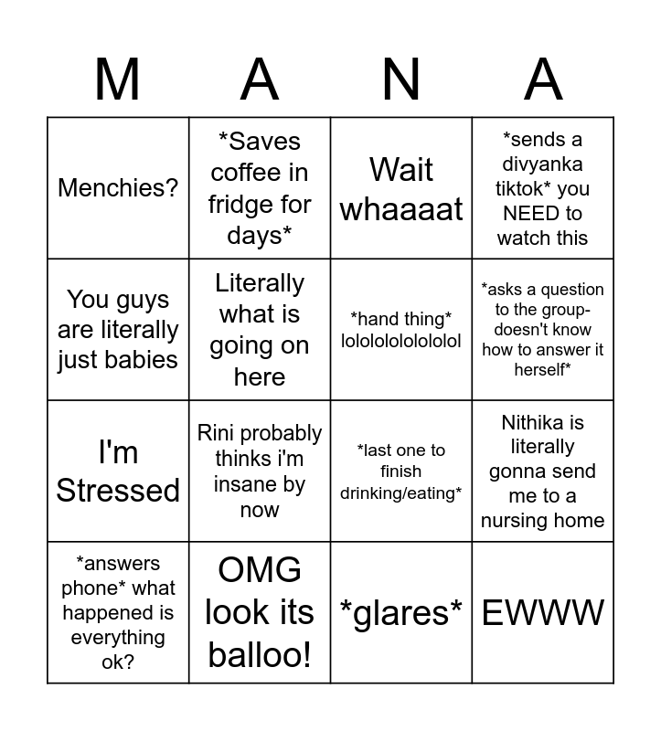 This bingo card has 16 words: OMG look its balloo!, Nithika is literally gonna send me to a nursing home, Wait whaaaat, Menchies?, I'm Stressed, *Saves coffee in fridge for days*, *last one to finish drinking/eating*, *glares*, You guys are literally just babies, Literally what is going on here, *answers phone* what happened is everything ok?, *sends a divyanka tiktok* you NEED to watch this, Rini probably thinks i'm insane by now, *asks a question to the group- doesn't know how to answer it herself*, *hand thing* lolololololololol and EWWW.