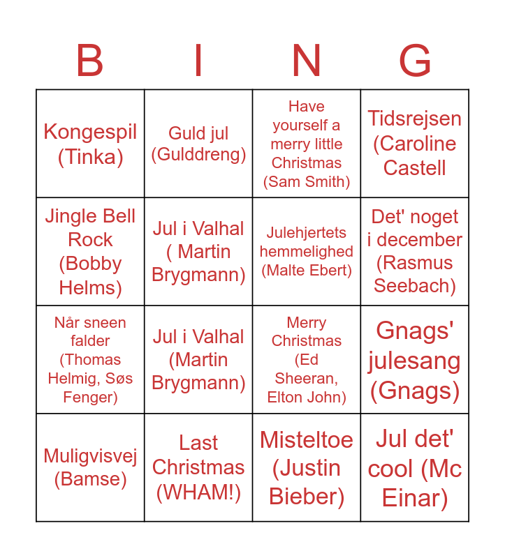 This bingo card has 16 words: Last Christmas (WHAM!), Gnags' julesang (Gnags), Have yourself a merry little Christmas (Sam Smith), Kongespil (Tinka), Når sneen falder (Thomas Helmig, Søs Fenger), Guld jul (Gulddreng), Merry Christmas (Ed Sheeran, Elton John), Misteltoe (Justin Bieber), Jingle Bell Rock (Bobby Helms), Jul i Valhal ( Martin Brygmann), Muligvisvej (Bamse), Tidsrejsen (Caroline Castell, Jul i Valhal (Martin Brygmann), Det' noget i december (Rasmus Seebach), Julehjertets hemmelighed (Malte Ebert) and Jul det' cool (Mc Einar).