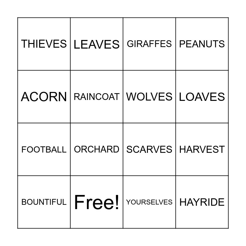 This bingo card has 21 words: Free!, KNIVES, LEAVES, SHELVES, YOURSELVES, WOLVES, THIEVES, GIRAFFES, SCARVES, LOAVES, FOOTBALL, PEANUTS, HAYRIDE, SCARECROW, RAINCOAT, PUMPKINS, BOUNTIFUL, ORCHARD, ACORN, HARVEST and WEATHER.