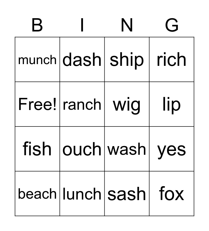 This bingo card has 16 words: lunch, yes, ship, munch, fish, dash, wash, sash, Free!, ranch, beach, rich, ouch, lip, wig and fox.