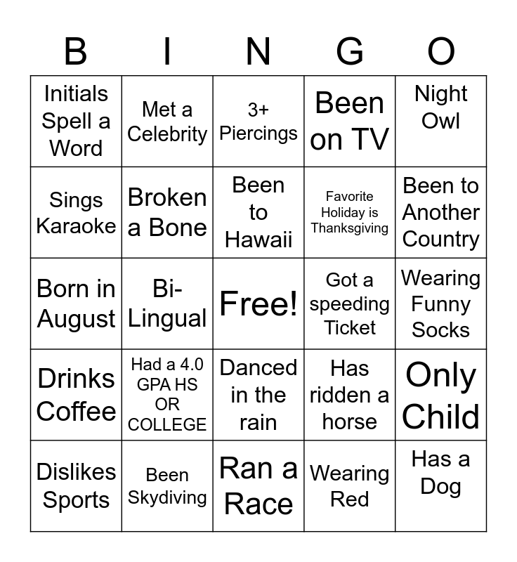 This bingo card has a free space and 29 words: Left Handed, Been Skydiving, 3+ Piercings, First Name Starts w/ Vowel, Night Owl, Initials Spell a Word, Broken a Bone, Been to Hawaii, Got a speeding Ticket, Only Child, Dislikes Sports, Bi-Lingual, Wearing Red, Has a Dog, Born in August, Likes Sushi, Ran a Race, Has ridden a horse, Been to Another Country, Drinks Coffee, Had a 4.0 GPA HS OR COLLEGE, Is a Twin, Favorite Holiday is Thanksgiving, Wearing Funny Socks, Sings Karaoke, Met a Celebrity, Danced in the rain, Been on TV and Faked being sick.