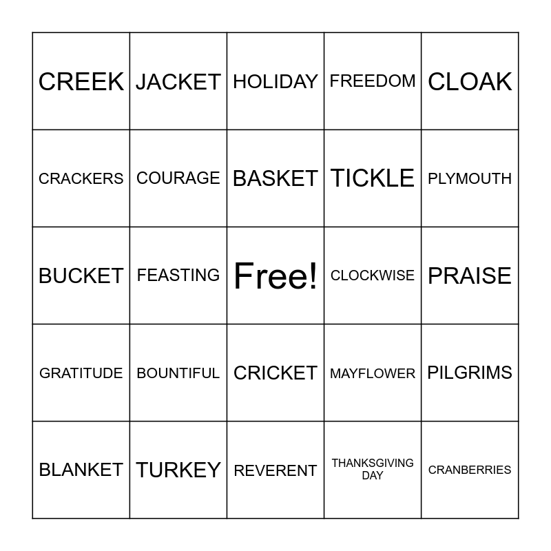 This bingo card has a free space and 24 words: BOUNTIFUL, TURKEY, BASKET, BLANKET, CLOAK, CREEK, CRACKERS, JACKET, CLOCKWISE, CRICKET, TICKLE, BUCKET, MAYFLOWER, PILGRIMS, COURAGE, THANKSGIVING DAY, PRAISE, HOLIDAY, PLYMOUTH, FEASTING, CRANBERRIES, GRATITUDE, FREEDOM and REVERENT.