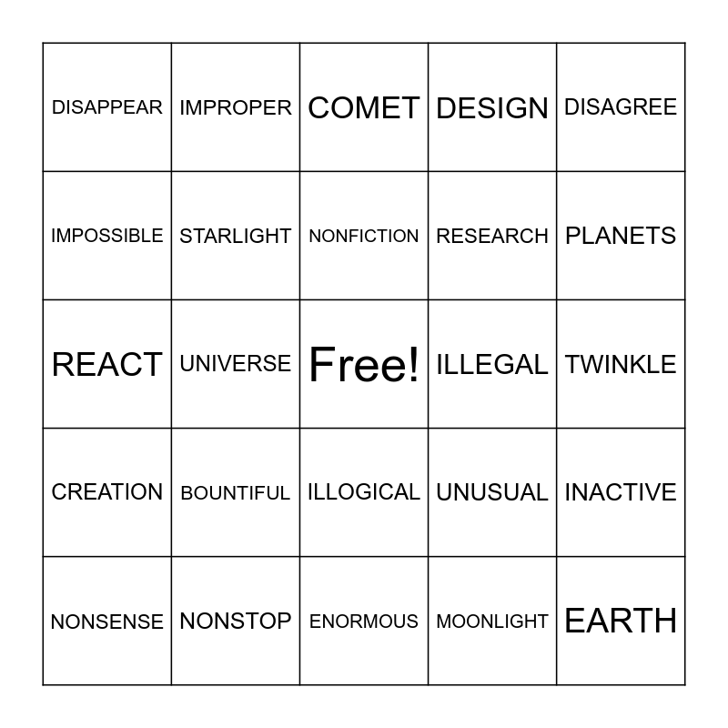 This bingo card has a free space and 24 words: BOUNTIFUL, NONSTOP, NONFICTION, NONSENSE, DISAGREE, DISAPPEAR, IMPOSSIBLE, IMPROPER, ILLEGAL, ILLOGICAL, RESEARCH, REACT, UNUSUAL, INACTIVE, STARLIGHT, MOONLIGHT, TWINKLE, COMET, PLANETS, UNIVERSE, EARTH, CREATION, DESIGN and ENORMOUS.