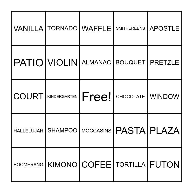 This bingo card has a free space and 25 words: SHAMPOO, COFEE, ALMANAC, BOOMERANG, APOSTLE, VANILLA, PATIO, TORNADO, CHOCOLATE, MOCCASINS, BOUQUET, COURT, PASTA, PLAZA, VIOLIN, TYPHOON, WINDOW, WAFFLE, PRETZLE, KINDERGARTEN, FUTON, KIMONO, HALLELUJAH, SMITHEREENS and TORTILLA.