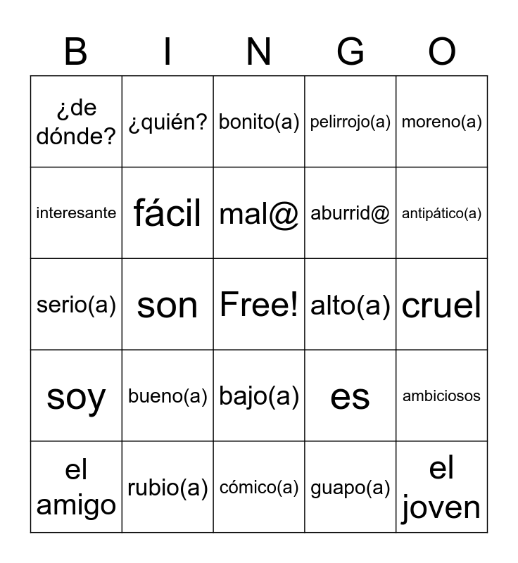 This bingo card has a free space and 44 words: el muchacho, el joven, la joven, el amigo, la amiga, guapo(a), bonito(a), feo(a), moreno(a), rubio(a), pelirrojo(a), alto(a), bajo(a), bueno(a), malo(a), cómico(a), gracioso(a), serio(a), simpático(a), antipático(a), ¿quién?, gracios@, ¿cómo?, ¿de dónde?, joven, cruel, inteligente, la capital, es, soy, eres, ambiciosos, perezosos, alumnos, son, grande, clase, buen@, mal@, interesante, aburrid@, difícil, fácil and pequeñ@.