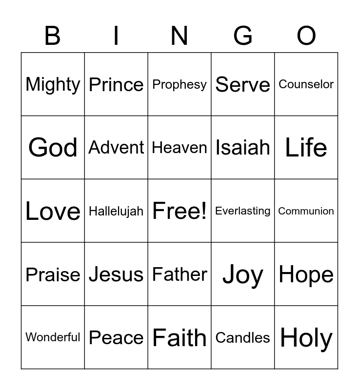 This bingo card has a free space and 24 words: Jesus, Peace, Heaven, Wonderful, Counselor, Mighty, God, Prince, Everlasting, Father, Isaiah, Love, Joy, Hope, Advent, Candles, Communion, Prophesy, Life, Hallelujah, Holy, Praise, Serve and Faith.