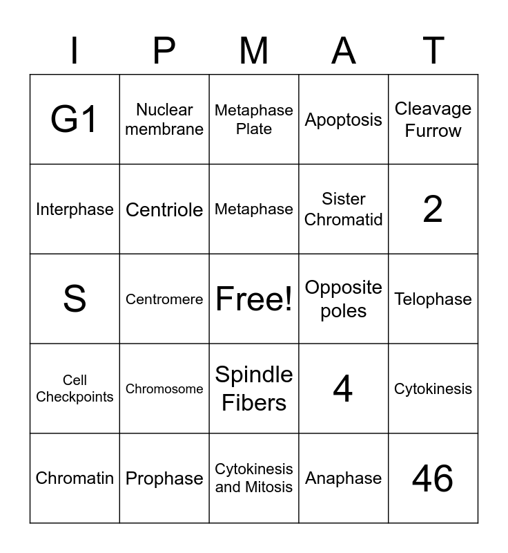 This bingo card has a free space and 24 words: Chromatin, Chromosome, Metaphase, Anaphase, Cleavage Furrow, G1, Nuclear membrane, Metaphase Plate, Opposite poles, Telophase, S, Centriole, 4, Cytokinesis, Interphase, Prophase, Cytokinesis and Mitosis, Apoptosis, 2, Cell Checkpoints, Centromere, Spindle Fibers, Sister Chromatid and 46.
