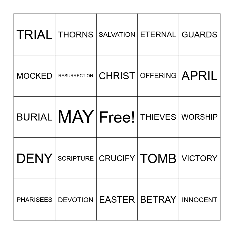 This bingo card has a free space and 25 words: SCRIPTURE, EASTER, CHRIST, PHARISEES, GUARDS, TRIAL, MOCKED, THORNS, THIEVES, CRUCIFY, OFFERING, BURIAL, TOMB, VICTORY, RESURRECTION, FORGIVENESS, WORSHIP, SALVATION, APRIL, MAY, INNOCENT, DEVOTION, DENY, ETERNAL and BETRAY.