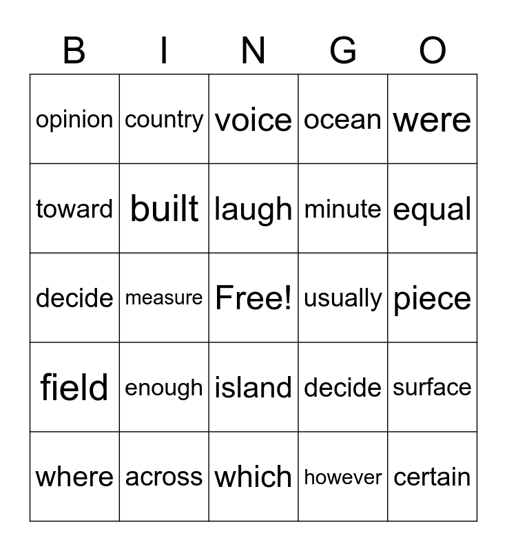 This bingo card has a free space and 24 words: enough, across, laugh, where, were, opinion, toward, country, usually, island, minute, decide, decide, surface, built, however, piece, voice, equal, measure, certain, field, ocean and which.