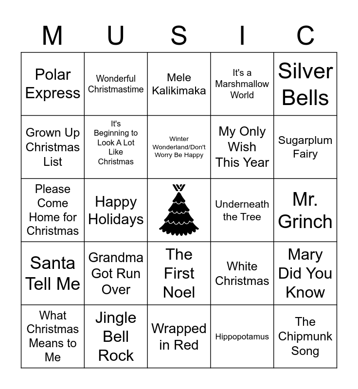 This bingo card has a free space and 36 words: Merry Christmas Happy Holidays, All I Want For Christmas Is You, It's the Most Wonderful Time of the Year, It's Beginning to Look A Lot Like Christmas, White Christmas, Santa Tell Me, Winter Wonderland/Don't Worry Be Happy, Rudolph, Silver Bells, Frosty the Snowman, Happy Holidays, It's a Marshmallow World, We Need a Little Christmas, Underneath the Tree, Sugarplum Fairy, Polar Express, Believe, Grandma Got Run Over, The Chipmunk Song, Mele Kalikimaka, Mr. Grinch, Mary Did You Know, Jingle Bell Rock, What Christmas Means to Me, Wrapped in Red, Wonderful Christmastime, Please Come Home for Christmas, Winter Wonderland/Sleigh Ride, My Only Wish This Year, Grown Up Christmas List, Do You Hear What I Hear, Take Me Home for Christmas, Hippopotamus, The First Noel, Winter Song and Sleigh Ride.