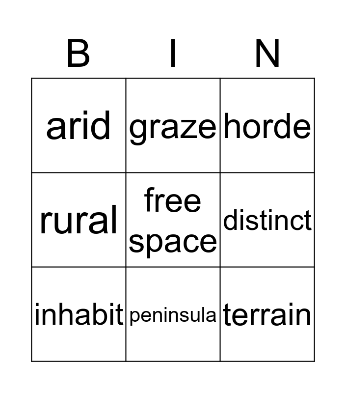This bingo card has a free space and 8 words: distinct, horde, graze, inhabit, arid, terrain, rural and peninsula.