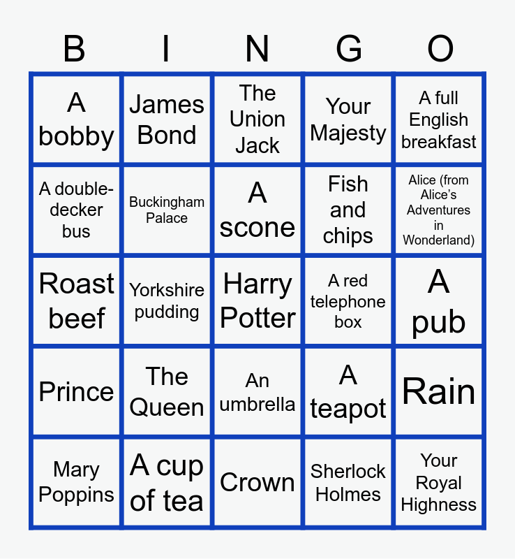 This bingo card has a free space and 24 words: The Queen, A cup of tea, A scone, Mary Poppins, A full English breakfast, A bobby, A double-decker bus, James Bond, A red telephone box, An umbrella, Fish and chips, Roast beef, A teapot, Rain, Buckingham Palace, Sherlock Holmes, A pub, The Union Jack, Alice (from Alice’s Adventures in Wonderland), Yorkshire pudding, Your Royal Highness, Prince, Your Majesty and Crown.