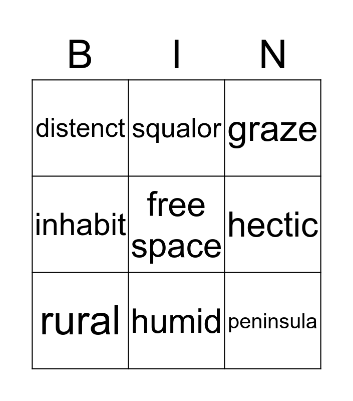 This bingo card has a free space and 8 words: hectic, graze, squalor, rural, distenct, peninsula, inhabit and humid.