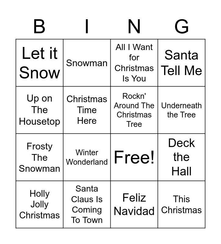 This bingo card has 19 words: Free!, Jingle Bells, All I Want for Christmas Is You, This Christmas, Deck the Hall, Up on The Housetop, Feliz Navidad, Let it Snow, Snowman, Frosty The Snowman, Winter Wonderland, Christmas Time Here, Rockn' Around The Christmas Tree, Santa Claus Is Coming To Town, Holly Jolly Christmas, Last Christmas, Santa Tell Me, Underneath the Tree and Jingle Bell Rock.