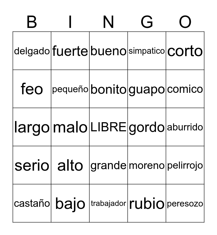 This bingo card has a free space and 24 words: alto, bajo, bonito, castaño, corto, delgado, feo, fuerte, gordo, grande, guapo, largo, moreno, pelirrojo, pequeño, rubio, aburrido, bueno, comico, malo, peresozo, serio, simpatico and trabajador.