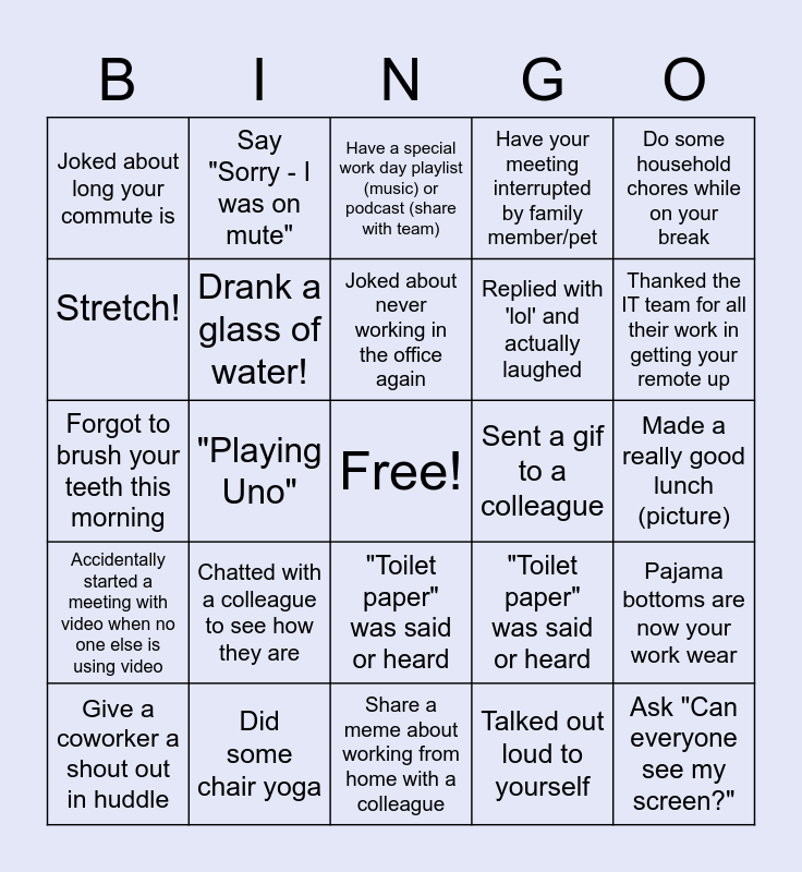 This bingo card has a free space and 27 words: Say "Can you hear me?", Did some chair yoga, Joked about never working in the office again, Talked out loud to yourself, Do some household chores while on your break, Stretch!, Say "Sorry - I was on mute", Share a meme about working from home with a colleague, Sent a gif to a colleague, Pajama bottoms are now your work wear, Accidentally started a meeting with video when no one else is using video, Drank a glass of water!, "Toilet paper" was said or heard, Ask "Can everyone see my screen?", Forgot to brush your teeth this morning, Made a really good breakfast (picture), Have a special work day playlist (music) or podcast (share with team), Have your meeting interrupted by family member/pet, Made a really good lunch (picture), Joked about long your commute is, Chatted with a colleague to see how they are, "Toilet paper" was said or heard, Replied with 'lol' and actually laughed, Thanked the IT team for all their work in getting your remote up, Give a coworker a shout out in huddle, "Playing Uno" and "Playing Monopoly".