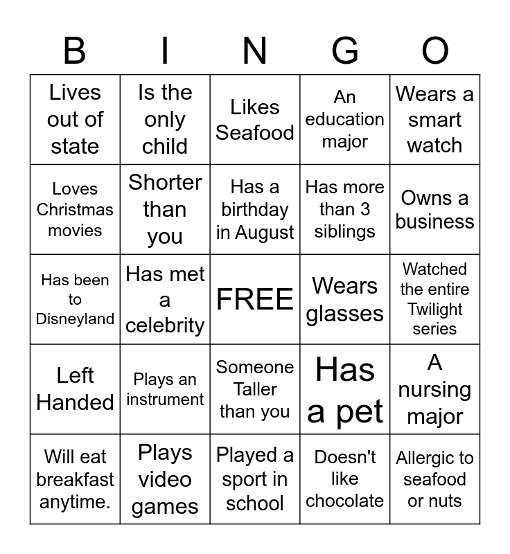 This bingo card has a free space and 24 words: Plays an instrument, Plays video games, Has a birthday in August, Will eat breakfast anytime., Wears a smart watch, Lives out of state, Loves Christmas movies, Is the only child, Wears glasses, Someone Taller than you, Has more than 3 siblings, Has been to Disneyland, Has a pet, A nursing major, Shorter than you, Doesn't like chocolate, Watched the entire Twilight series, Likes Seafood, Owns a business, Has met a celebrity, Allergic to seafood or nuts, Left Handed, An education major and Played a sport in school.