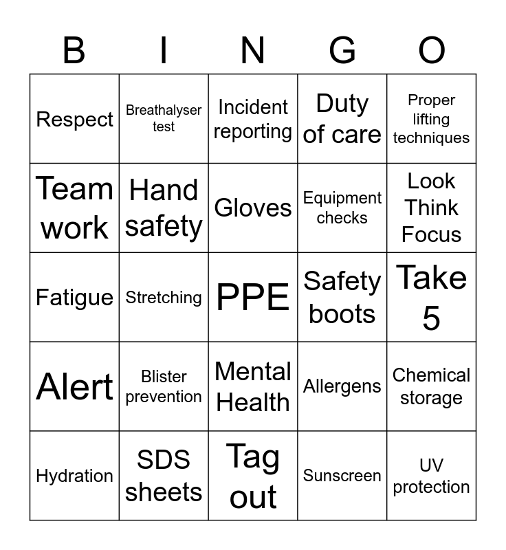 This bingo card has a free space and 29 words: Hydration, Eye protection, Stretching, Micro breaks, Respect, Incident reporting, Hand safety, Blister prevention, Safety boots, SDS sheets, Take 5, UV protection, Tag out, Sunscreen, Look Think Focus, Housekeeping in the workplace, Mental Health, Alert, Proper lifting techniques, Fatigue, Allergens, Chemical safety, Equipment checks, Team work, Duty of care, Breathalyser test, Chemical storage, Gloves and Hazards.