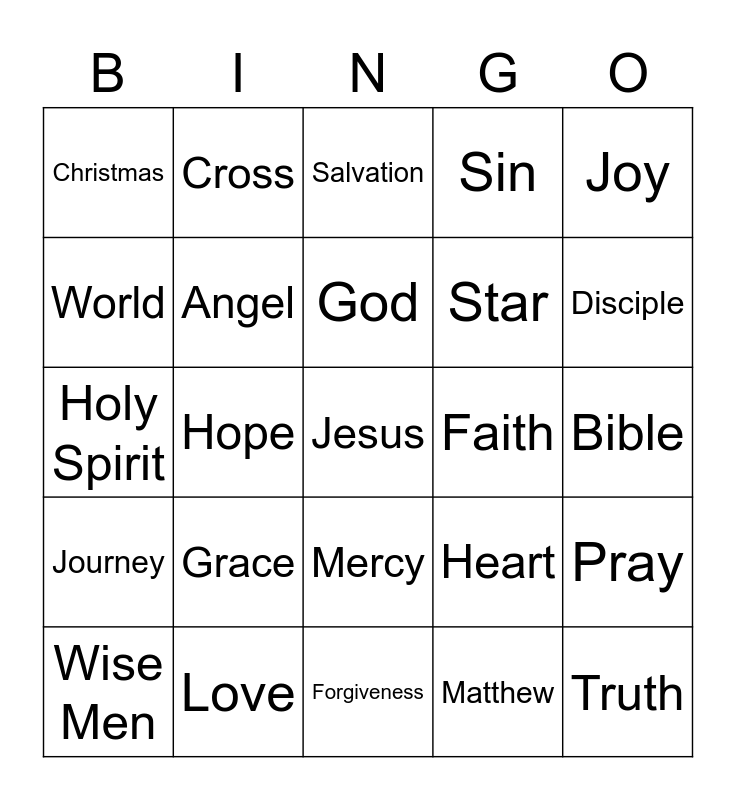 This bingo card has a free space and 24 words: Grace, Love, God, Wise Men, Joy, Christmas, World, Cross, Faith, Mercy, Star, Holy Spirit, Heart, Pray, Angel, Matthew, Bible, Salvation, Disciple, Hope, Truth, Journey, Sin and Forgiveness.